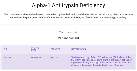 Näytteiden analysoinnin jälkeen laboratorio toimittaa sinulle kattavan terveysraportin, joka sisältää tiedot geneettisestä alttiudestasi monimutkaisille sairauksille ja perinnöllisille monogeenisille sairauksille, kuten perinnölliselle rintasyövälle, transthyretin-amyloidoosille ja alfa-1-antitrypsiinin puutteelle.