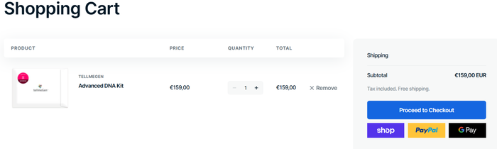 Käy laboratorion virallisella verkkosivustolla ja valitse haluamasi DNA-paketti (Starter, Advanced tai Ultra). Täytä sitten tilauslomake täydellisellä nimelläsi ja osoitteellasi. Suorita ostos tavallisilla maksutavoilla (luottokortti, PayPal, Shop Pay, Google Pay tai Klarna).