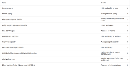 Terveysosio on yhtä kattava ja käsittelee perinnöllisiä sairauksia, monimutkaisia geneettisiä haavoittuvuuksia ja farmakogeneettisiä tietoja. Tähän lisätään lukuisien henkilökohtaisten ominaisuuksien analyysi: aineenvaihdunta, fyysiset ominaisuudet ja biologiset taipumukset. Mielestämme tämä on paras tarjous Euroopan DNA-markkinoilla ja yksinkertaisesti ihanteellinen vaihtoehto geneettisen perimän yksityiskohtaiseen ymmärtämiseen.