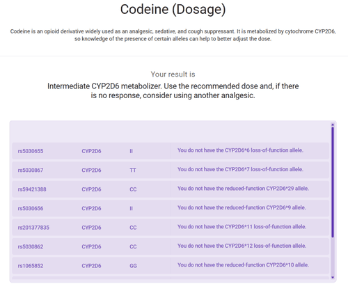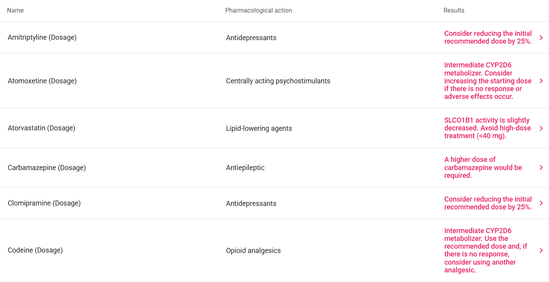 Samalla farmakogenetiikan raportti analysoi, kuinka kehosi metabolisoi yli 95 lääkettä, kuten kodeiini tai amitriptyliini. Tietyt hoidot eivät ole kovin tehokkaita joillekin ihmisille tiettyjen geneettisten varianttien vuoksi, ja TellMeGen kertoo sinulle, mitkä niistä voivat vaikuttaa sinuun.